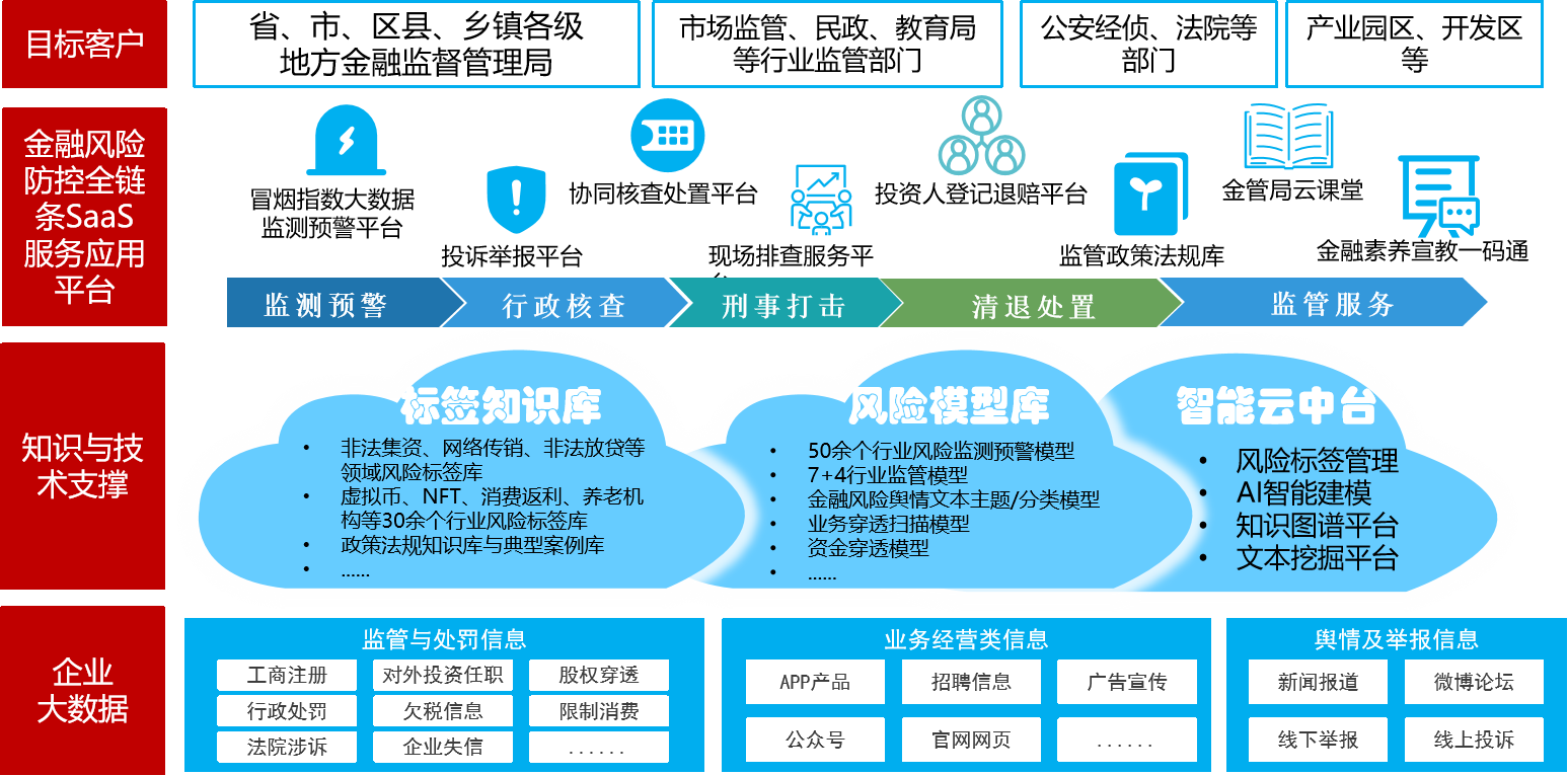 冒烟指数聚焦地方金融风险防控,基于对企业大数据的采集、分析,金融风险特征提取、标注,预警模型搭建,及对“主动监测-分级预警-量化分析-核查化解-分类处置”全业务流程的梳理研究,形成金融风险防控全链条产品体系,致力于运用监管科技为地方金融监管局、公安经侦、行业主(监)管等部门赋能,创新监管思维方法、提升数字化监管能力。