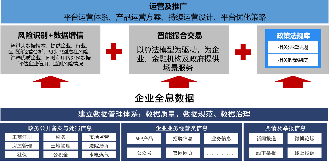 基于政务、企业上报、公开数据采集,应用大数据、人工智能、加密算等技术,搭建政府、 金融组织、企业三者之间的服务平台,为政府、金融组织和中小微企业给予综合性的智能化融资服务,化解中小企业融资难题。